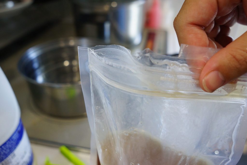 スープはジップで止められているので入れやすいです。琴平荘のスープと同じ匂いがするぅぅぅ!